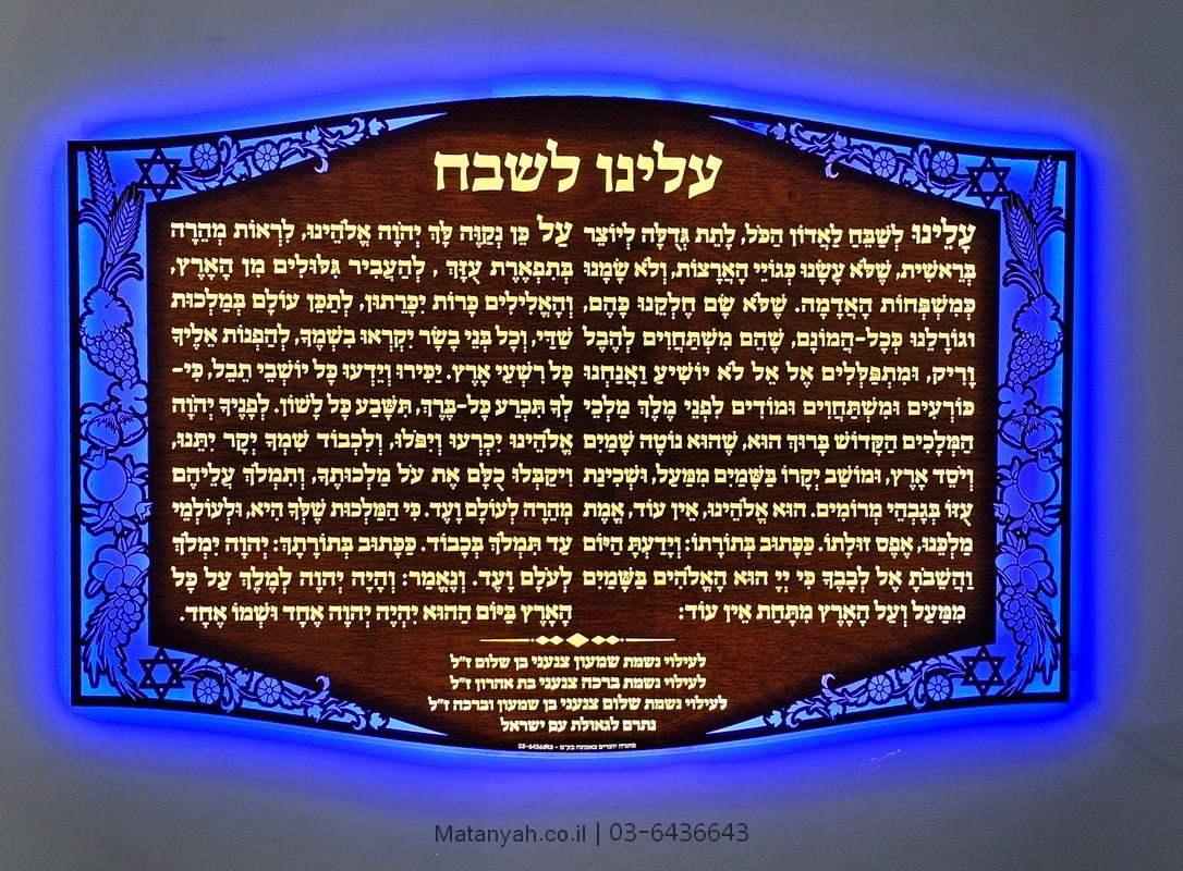 לוח תפילה עלינו לשבח מואר בלד עם קישוטי שבעת המינים מסביב