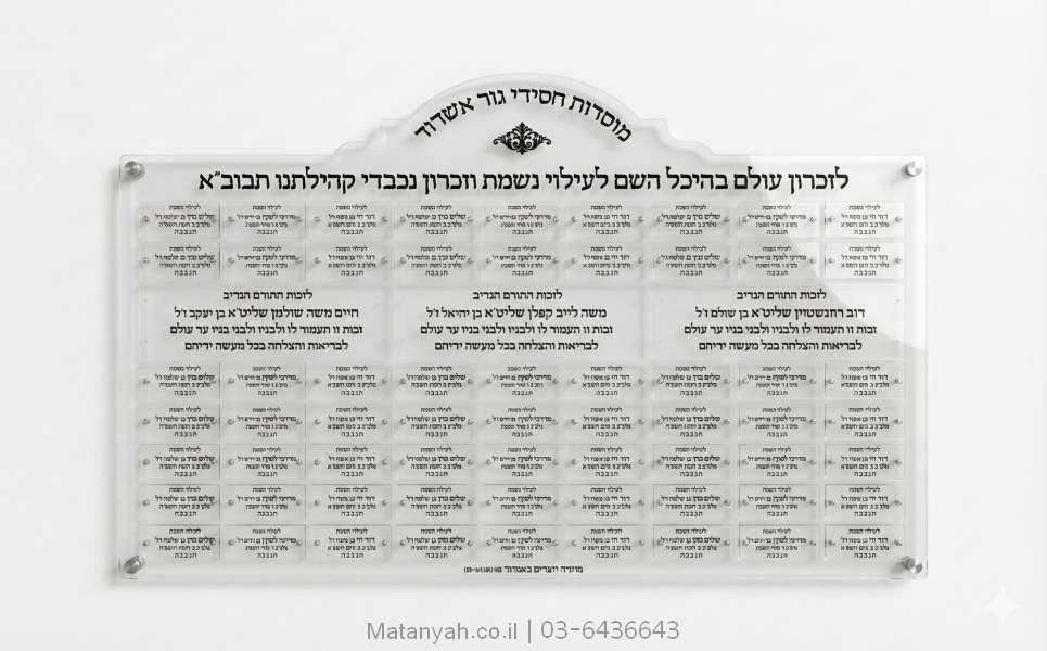 לוח תורמים והנצחה אשדוד עשוי פרספקס ניתן לבחור גוון חומר וגווני תאורה