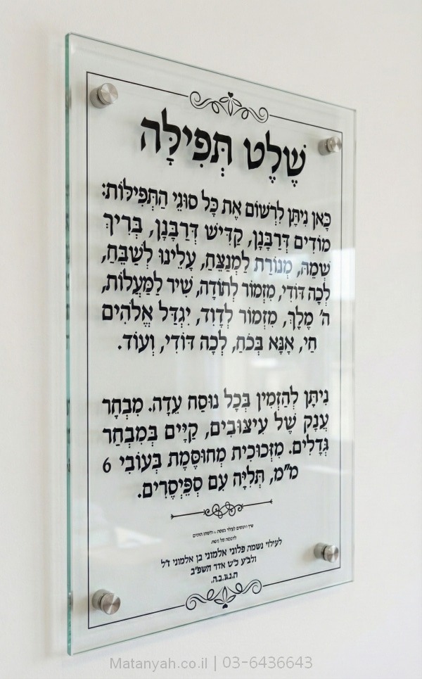 את לוח תפילה זכוכית אור הקו אפשר לקבל בתפילות הבאות, מוֹדִים דְּרַבָּנָן, קַדִּישׁ דְּרַבָּנָן, בְּרִיךְ שְׁמֵהּ, מְנוֹרַת לַמְנַצֵּחַ, עָלֵינוּ לְשַׁבֵּחַ, לְכָה דּוֹדִי, מִזְמוֹר לְתוֹדָה, שִׁיר לַמַּעֲלוֹת, ה' מֶלֶךְ, מִזְמוֹר לְדָוִד, יִגְדַּל אֱלֹהִים חַי, אָנָּא בְּכֹחַ, לְכָה דּוֹדִי, וְעוֹד.